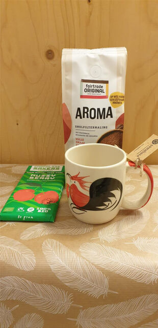 | Een handgemaakte aardewerken beker uit Thailand met een afdekschaaltje, tevens te gebruiken als lekbakje voor je theezakje. En een doos Fairtrade Original Green Tea. | Een mooi gedecoreerde beker uit Thailand, met de hand gemaakt en een pak Fairtrade koffie snelfiltermaling. Mét daarbij een 100% biologische chocolade van Chocolate Makers. |