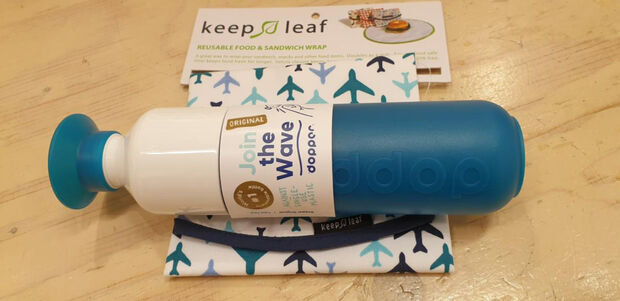 | Met dit pakket bent u milieubewust. De welbekende Dopper voor uw drankje en een prachtig duurzaam alternatief voor de plastic broodzak, een herbruikbare broodenvelop. € 23,50*) | |